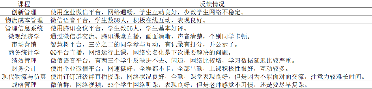 学院根据2019-2020学年第二学期课表中的教学安排和课程教学大纲,先制订了4周(2020年2月17日至2020年3月15日)在线教学方案,明确教学方式、教学目标、内容、考核方式及学习效果评价。为及时了解各班级在线学习情况,建立班级与学院每天收集、每周汇总的双向反馈平台。每天由学习委员及时收集学生的相关学习疑问,每周结束后由学风督导与就业中心统计反馈给各科老师,老师们结合学生的反馈以及个人课堂体验对教学软件使用情况、学生互动效果进行调整。