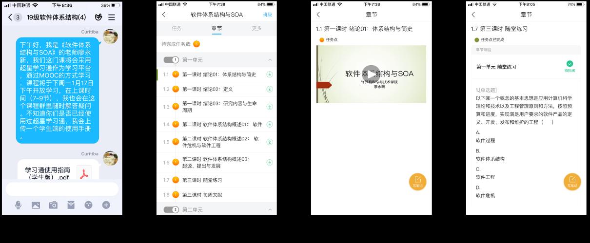 廖永新老师的《软件体系结构与SOA》是软件工程专业研究生的专业学位课,需要学生进行探索实践。他采用了“超星学习通”作为平台,以“MOOC + 探索实践 + 即时答疑”的方式来进行在线授课。在MOOC部分,课程依据正常上课时间发布,学生通过超星学习通完成课程的理论学习和随堂测验。在探索实践部分,课程依据所讲授的内容提出一个具体的实践任务由学生来完成。利用课程群,教师对学生提出的问题进行即时的解答。课程结束后,通过超星学习通来统计学生上课的记录、任务完成度、随堂测验正确率、学生所提出的疑问等。