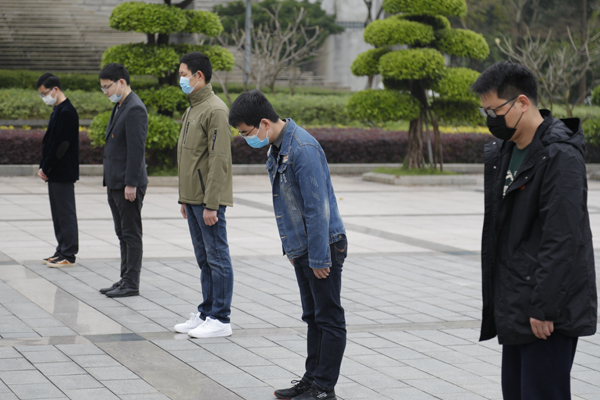 工商管理学院团委书记文竞之在默哀结束后说:“我们应当牢记这次抗疫斗争中英雄和同胞们所作出的牺牲,奋发努力,团结进取,去展现中国力量、中国自信。”