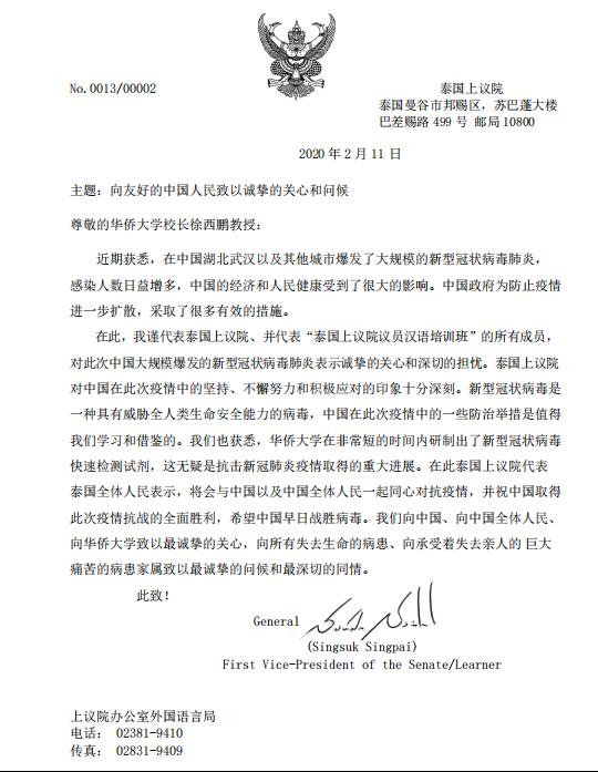 泰国上议院第一副议长代表上议院与泰国农大孔院合作的“泰国上议院汉语培训班”全体成员向sjb世俱杯官方网站表达慰问