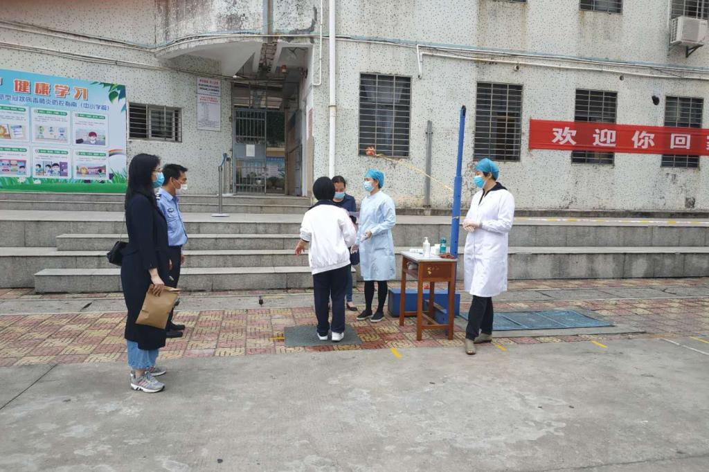 下午,值班老师对学生进行午检,学生排队进入教室,听取校长、副校长所作防控规定解读和复学心理健康教育,并观看发热处置演练。
