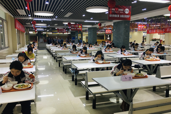 11:45,学生到教学楼外的空地整队集合,在老师带领下排队前往第二餐厅。据了解,第二餐厅特别准备了附中学生专门窗口和专用就餐楼层,并规划好学生用餐路线。学生排队取餐,并保持“一米线”等候。就餐时在贴好名字的桌子上用餐,一人一桌,同一方向。