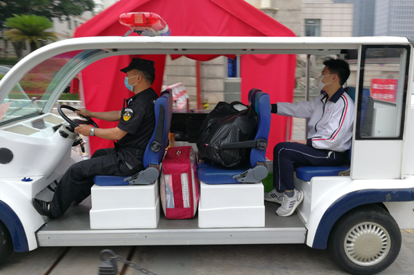 当日8:50—10:10,华大附中校外学生按之前预约的到达时间,每十人一个时间段,分批次分别到达校大门口。经体温检测和扫健康码后,开车家长领取车辆号码牌,送学生进入学校直至附中,期间家长不下车,按规定路线进出, 出大门时凭车辆号码牌换回证件。没有家长开车送的学生,由保卫处统一安排电瓶车送至附中。在附中,校医院两位保健医生分别给学生测量体温,对行李进行消毒处理等,住宿生经测温、洗手、鞋底消毒后方可进入宿舍区。10:00,住在校园内的学生也陆续到校报到。至此,华大附中92名初三学生顺利完成报到,整个过程井然有序。