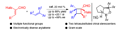 环丁烷结构单元广泛存在于具有生理活性的分子和天然产物中,其也可作为原料进行多种化学转化,是有机反应中的一类重要合成砌块。由于具有较大的环张力,手性环丁烷化合物的合成具有挑战性,尤其是带有季碳中心的环丁烷的手性合成很少有文献报道。[2+2]环化反应是合成四元环的主要途径,目前存在以下难题:1.由于过渡态中涉及到正负离子偶极体或者自由基,因此反应的非对映选择性难以控制。目前研究集中于对称的反应底物来避免这一难题,但此类反应的产物不具备季碳手性中心。2.由于环张力较大而难以合成,目前研究所采用的反应底物局限于高反应活性的烯烃。基于目前研究,课题组发展了一种高效催化体系,首次实现了路易斯酸催化的非对称反应底物的高选择性[2+2]环化反应,并且反应活性较弱的烯烃也适用于此催化体系。反应过程中,由于受到分子间pi-pi作用力的吸引,以及部分顺式产物向反式产物的转化,反应的非对映选择性得到提高。产物环丁烷具有两个季碳手性中心,并且带有卤素、醛等官能团,利于进一步修饰。此催化合成方法的建立,大大扩展了环丁烷分子的结构多样性。