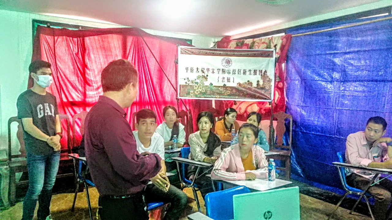 华文学院“云校区”设立线下新生报到点,老生为新生开展“云校区”注册指导等