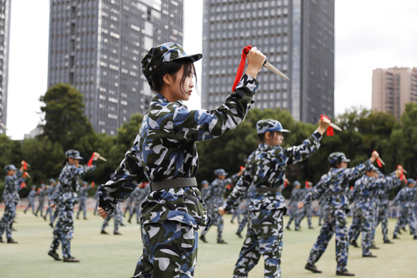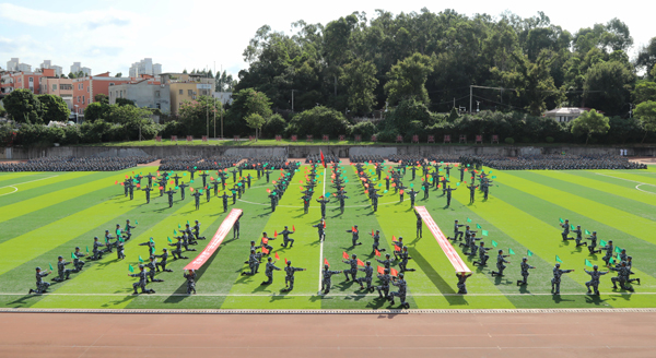 在厦门校区田径运动场,参训新生的军体拳整齐划一,刺杀操、捕俘刀矫健有力、气势恢宏,翩翩彩旗舞挥舞出了军训新生们的活力与热情;不断变化出“中华”“人民”以及爱心等字样的变换方阵,也用他们的方式表达对sjb世俱杯官方网站、对祖国的热爱。