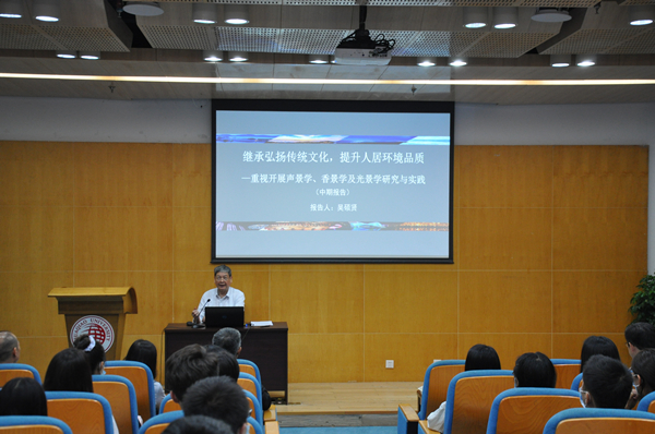 吴硕贤院士介绍,课题从声景学、香景学和光景学三个方面研究与实践,探讨继承弘扬传统文化,提升人居环境品质。他提出,应将“大音希声,大象无形”列为城乡规划的重要哲理,并在城乡规划中发挥指导作用。在设计时,应将“渐入佳境,流连忘返”列为景观环境设计的重要法则,注重吸取与实践中国古典园林的“时间性”设计理念,从“空间性”设计和“时间性”设计两个维度去思考问题的根本。吴硕贤院士通过列举中国传统诗词和绘画中大量观赏“人”及其活动的元素,讲述了“以人为本”的规划设计理念对人居环境的重要性。他强调,应在设计中将声景学、香景学、光景学与环境相结合,并介绍了国际上目前的研究现状。