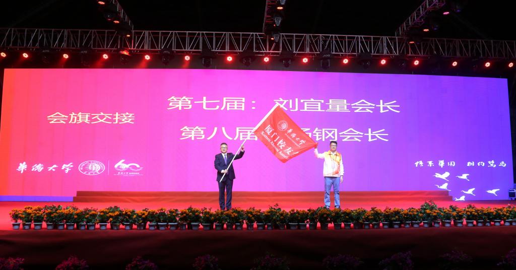 厦门校友会第七届会长刘宜量与新任会长杨钢交接会旗