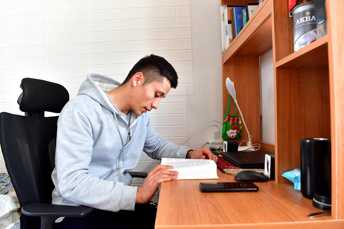 福山在寝室学习(张斌 摄)
