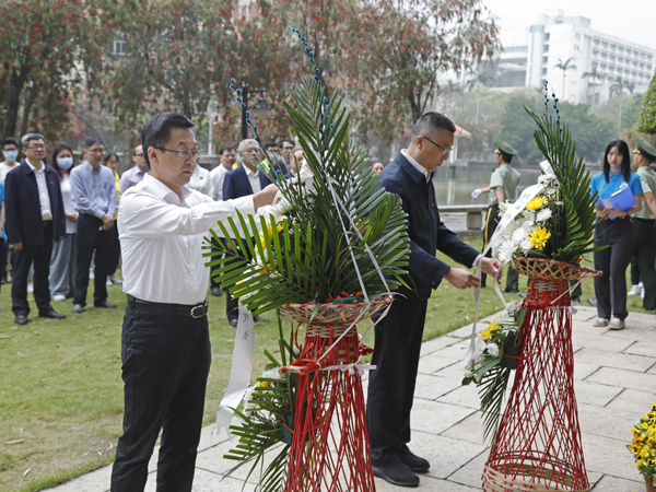 上午9时,校党委书记徐西鹏、校长吴剑平代表全校师生向廖公铜像敬献花篮,并整理花篮上的缎带。