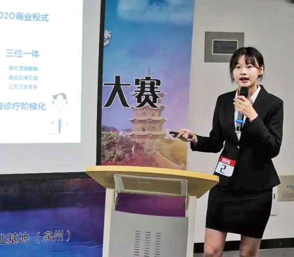 她“玩”科创。曾作为团队核心成员,参加第十届全国大学生电子商务“创新、创意及创业”挑战赛获国家三等奖、省特等奖,参加2020年泉州市大学生创新创意作品大赛获团队一等奖;作为团队队长,参加2020年海峡两岸女大学生创新创业大赛,获总决赛巧手匠心赛道铜奖、福建赛区银奖;作为团队第二负责人,参与大学生创新创业训练计划一个国家级项目和一个省级项目。此外,还曾获“互联网+”大学生创新创业大赛校赛团队铜奖等。