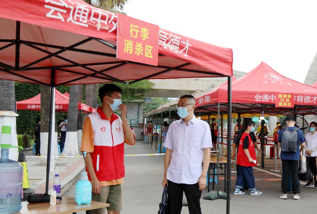 校长吴剑平到校门口关心询问学生返校情况,慰问现场工作的志愿者和工作人员