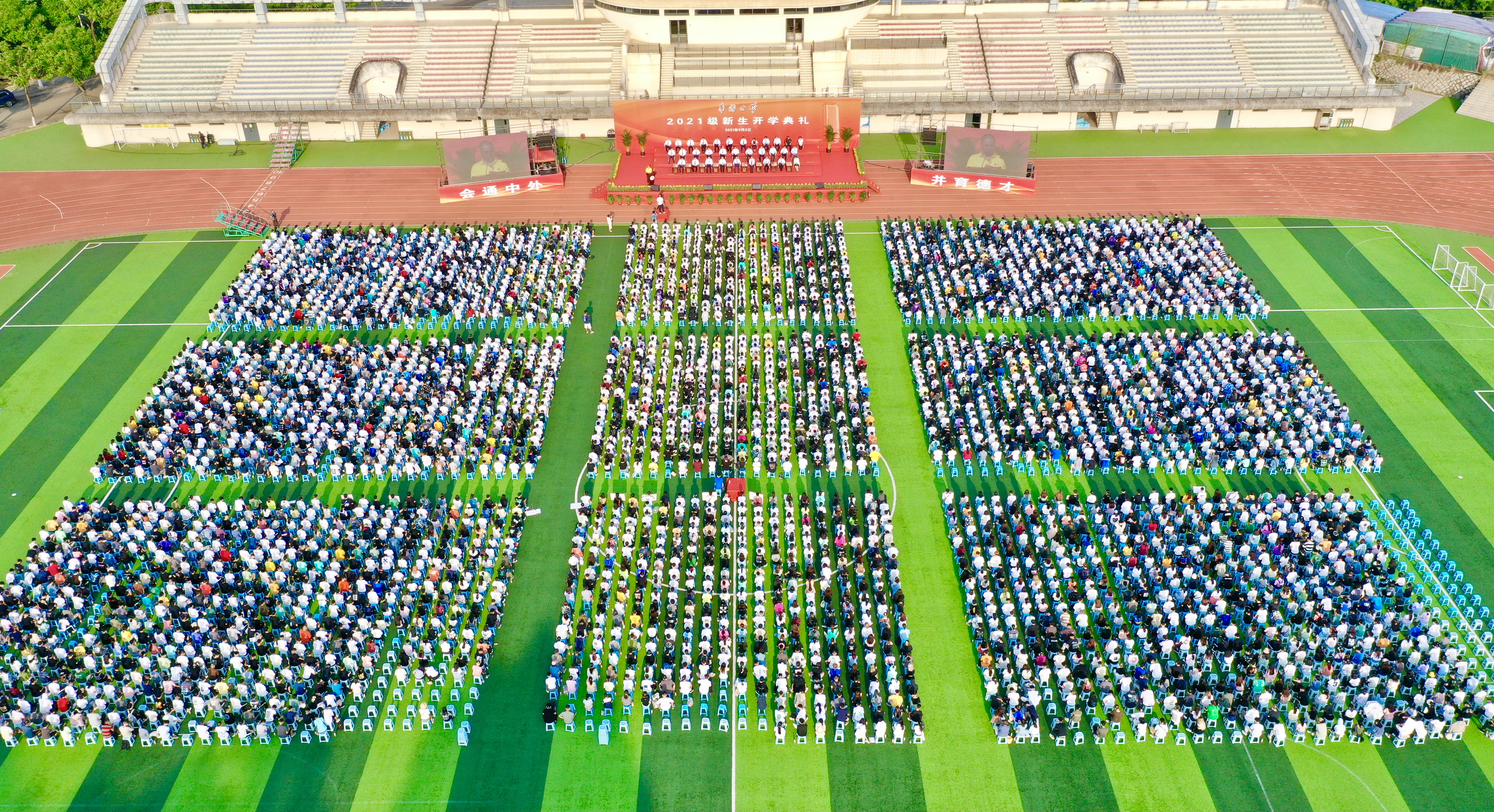 sjb世俱杯官方网站2021级新生开学典礼今日分别在泉州校区和厦门校区户外举行。因疫情防控需要,近900名在境外的新同学及其亲友无法亲临现场,学校通过新浪微博和微信视频号全程直播典礼,让他们可以共同参与和见证这一重要人生时刻。