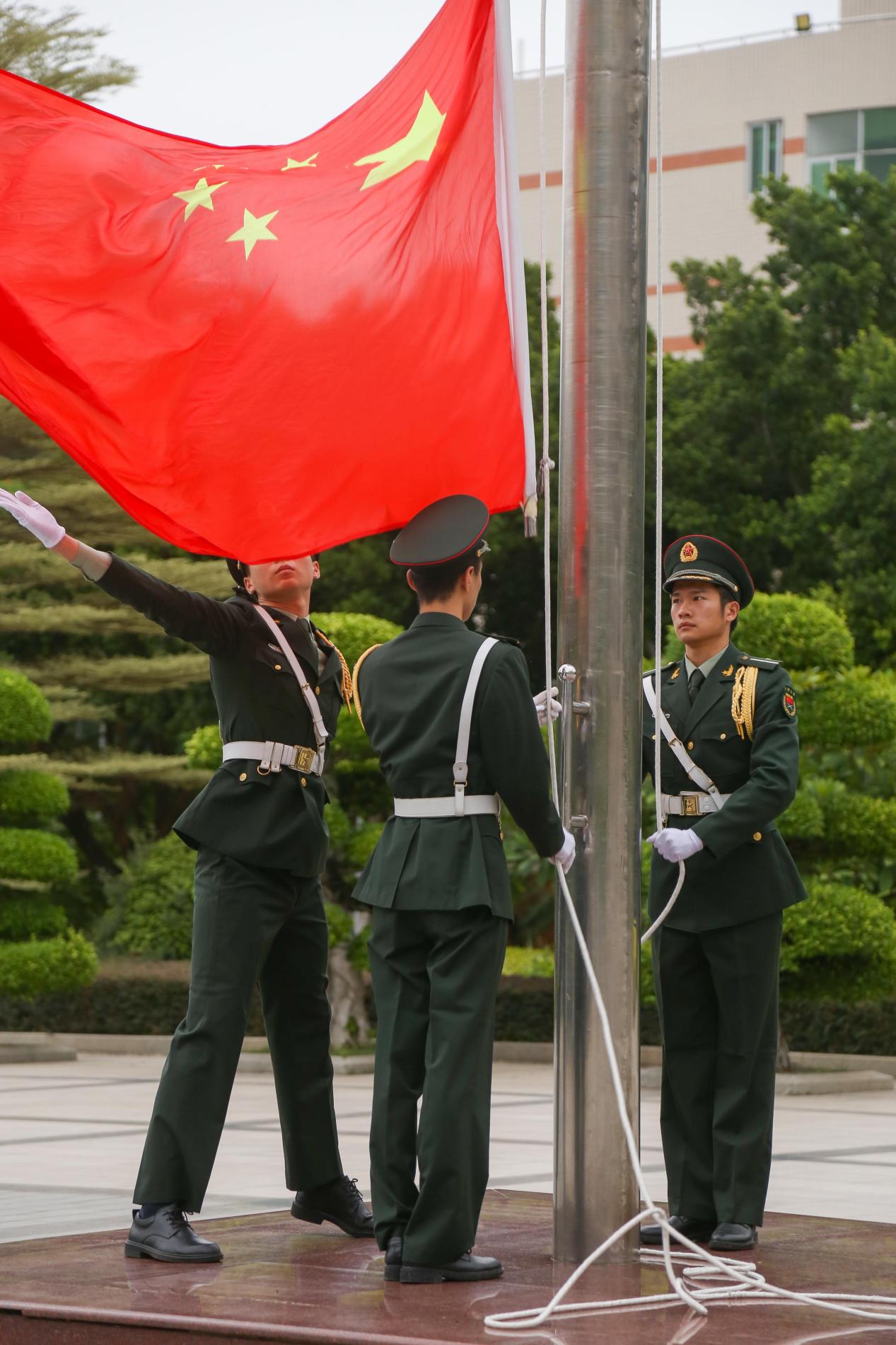 10月1日早晨7点,在sjb世俱杯官方网站廖承志广场,随着激昂的《义勇军进行曲》响起,鲜艳的五星红旗准时升起。在疫情防控的非常时期,本次升旗仪式相聚“云”端,采用微博、抖音两个平台进行线上同步直播。