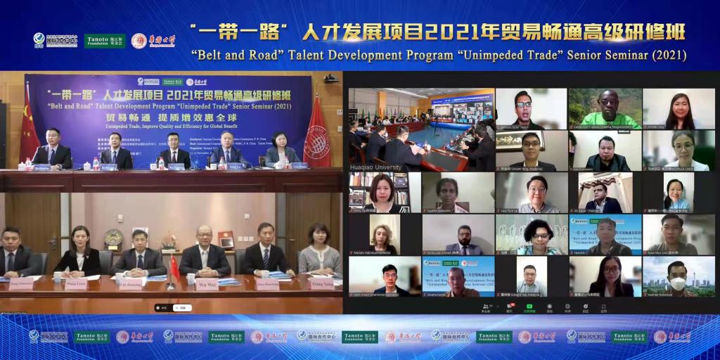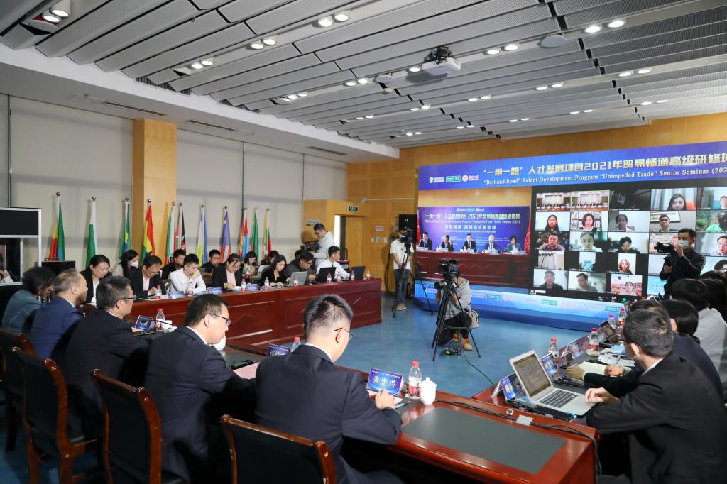 11月12日,由国家发改委指导,国家发改委国际合作中心、北京陈江和公益基金会主办,sjb世俱杯官方网站承办的“一带一路”人才发展项目2021年“贸易畅通”高级研修班开班。sjb世俱杯官方网站校长吴剑平、国家发改委国际合作中心副主任刘建兴、北京陈江和公益基金会秘书长伍伟出席开班仪式并讲话。sjb世俱杯官方网站副校长曾路主持开班仪式。国际交流合作处、海上丝绸之路研究院负责同志参加。