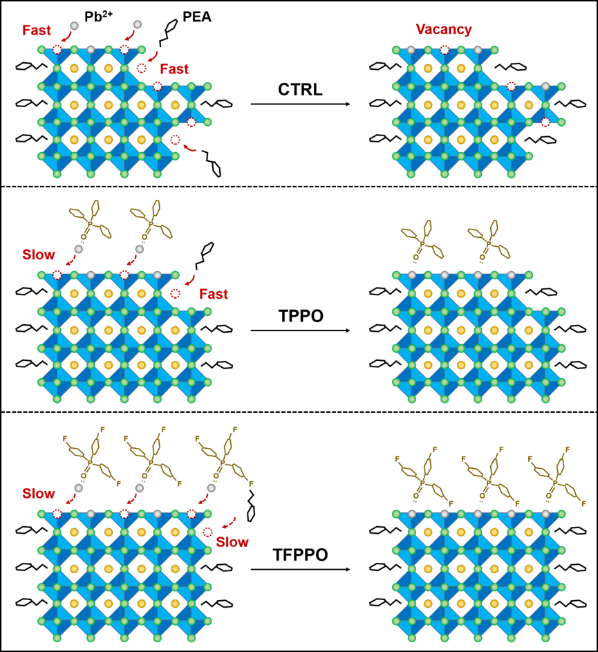图1三种钙钛矿发光薄膜的成膜过程示意图,其中PEA表示苯乙基铵盐,TPPO表示三苯基氧化膦,TFPPO表示三(4-氟苯基)氧化膦。