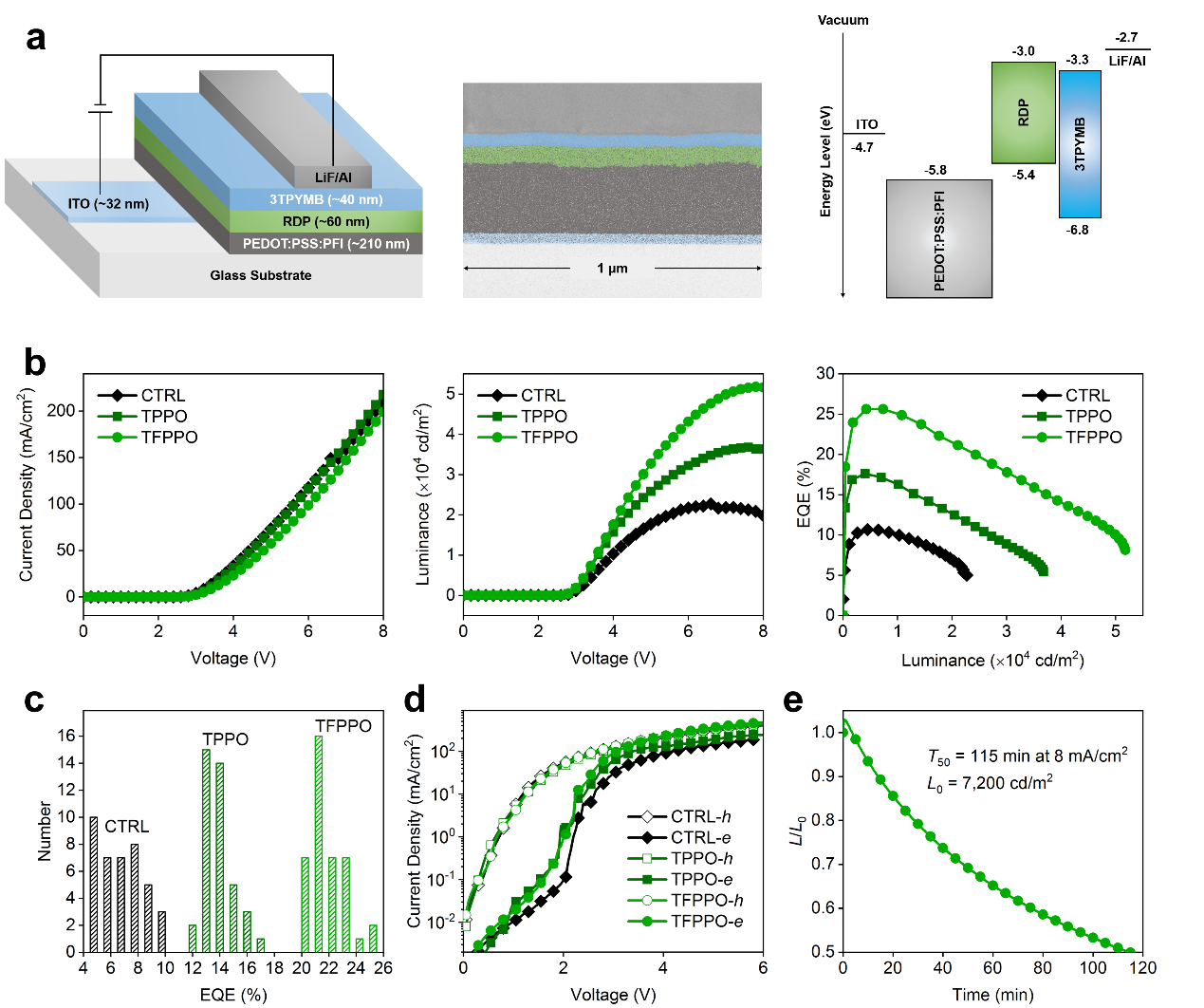 图2(a)钙钛矿LED器件的结构示意图、截面透射电镜图和能级结构示意图;(b)三种钙钛矿LED器件对应的电流-电压曲线、亮度-电压曲线和外量子效率-亮度曲线;(c)三种钙钛矿LED器件的外量子效率统计分布图;(d)三种钙钛矿的单电子和单空穴器件的电流-电压曲线;(e)基于TFPPO处理的钙钛矿LED器件的工况寿命曲线。