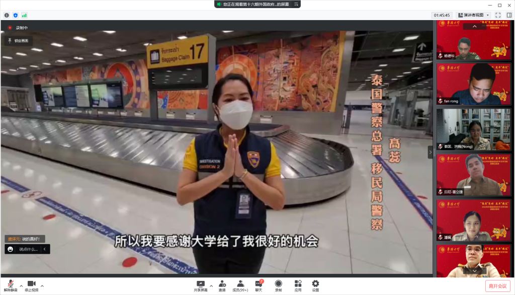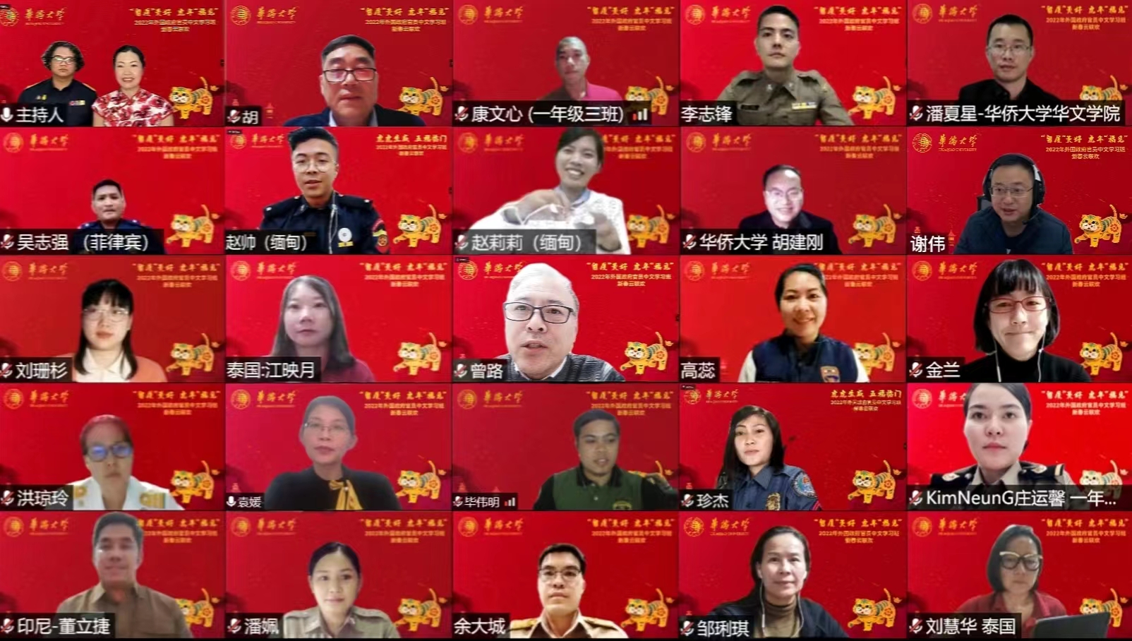 1月27日晚,sjb世俱杯官方网站第十六期外国政府官员中文学习班举办云端联欢晚会,共庆中国年。来自泰国、缅甸、老挝、印度尼西亚、菲律宾5个国家的全体学员及部分老生代表参加。