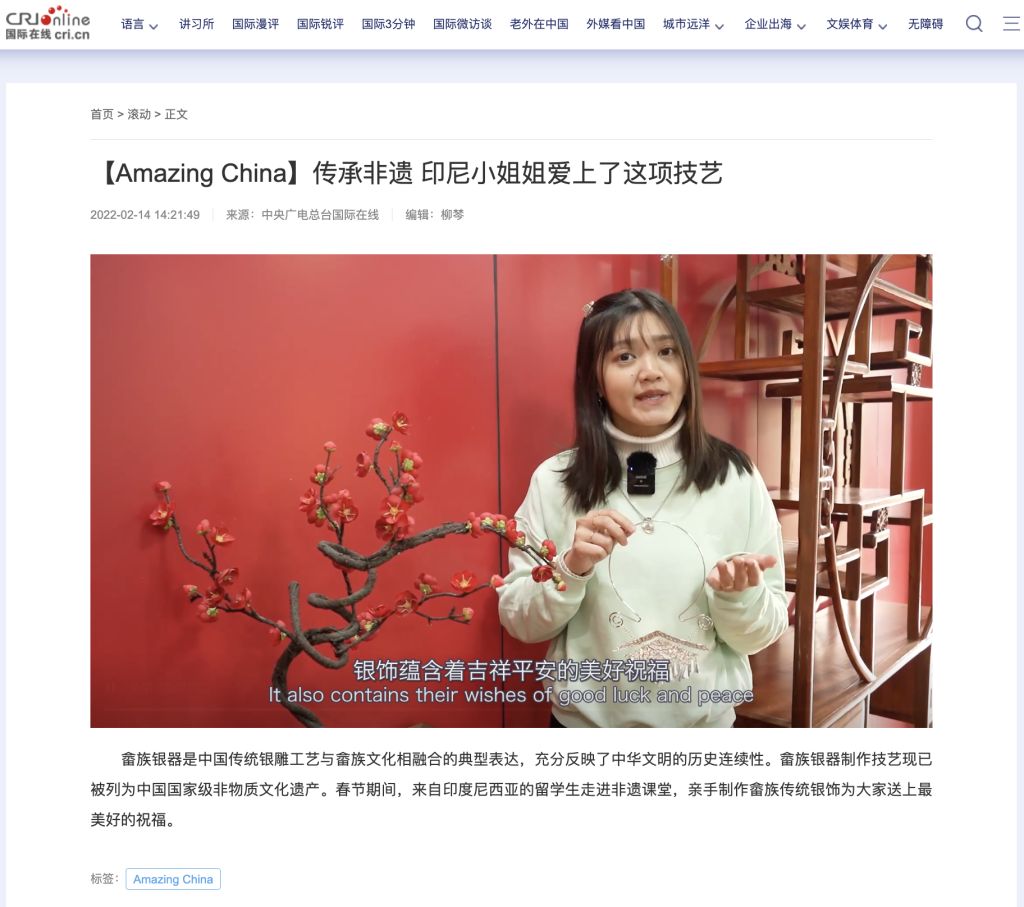 视频中,印度尼西亚的华裔留学生白家嘉深入了解畲族银器背后丰富多彩的民族文化内涵,亲手制作属于自己的畲族银器,并通过镜头表达了她的美好祝愿:“对于畲族人民来说银饰蕴含着吉祥平安的美好祝福,希望大家新的一年都能平平安安!”