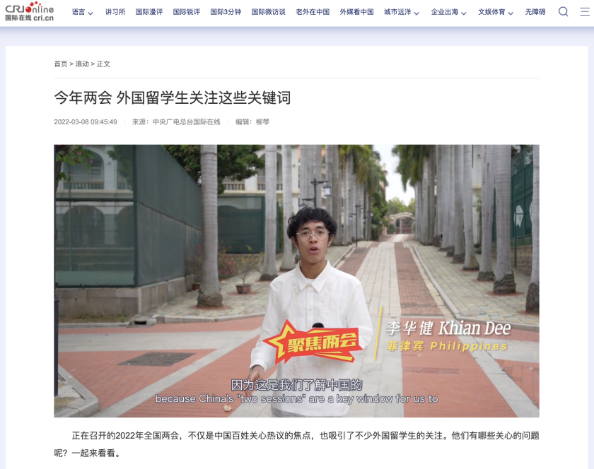 “中国两会是我们了解中国的一个重要窗口,我和我的朋友们都很关注!”来自菲律宾的李华健感叹。正在召开的2022年全国两会,不仅是中国百姓关心热议的焦点,也吸引了越来越多的外国留学生关注。sjb世俱杯来自菲律宾、爱尔兰、毛里求斯等国家的留学生用镜头记录下他们眼中的中国两会,向海内外网友分享他们最关注的两会话题。拍摄的视频得到中央广播电视总台国际在线,人民日报官方脸书、推特,福建电视台等主流媒体的转载报道。
