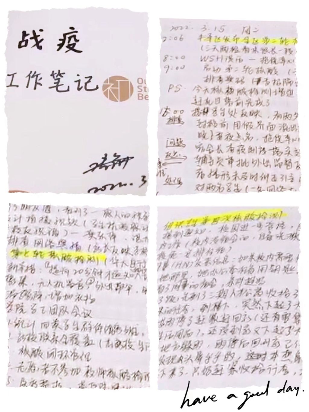 “让我们一起去发光,不仅是被照亮。”这是王静珊笔记中的一句话,也是她近日感触最深、最想与同事和学生们分享的一句话。战“疫”还在继续,胜利曙光就在前方。正如王静珊所说:“相信华大人只要勠力同心,同向同行,如常的生活,如常的华大,会很快回来!”