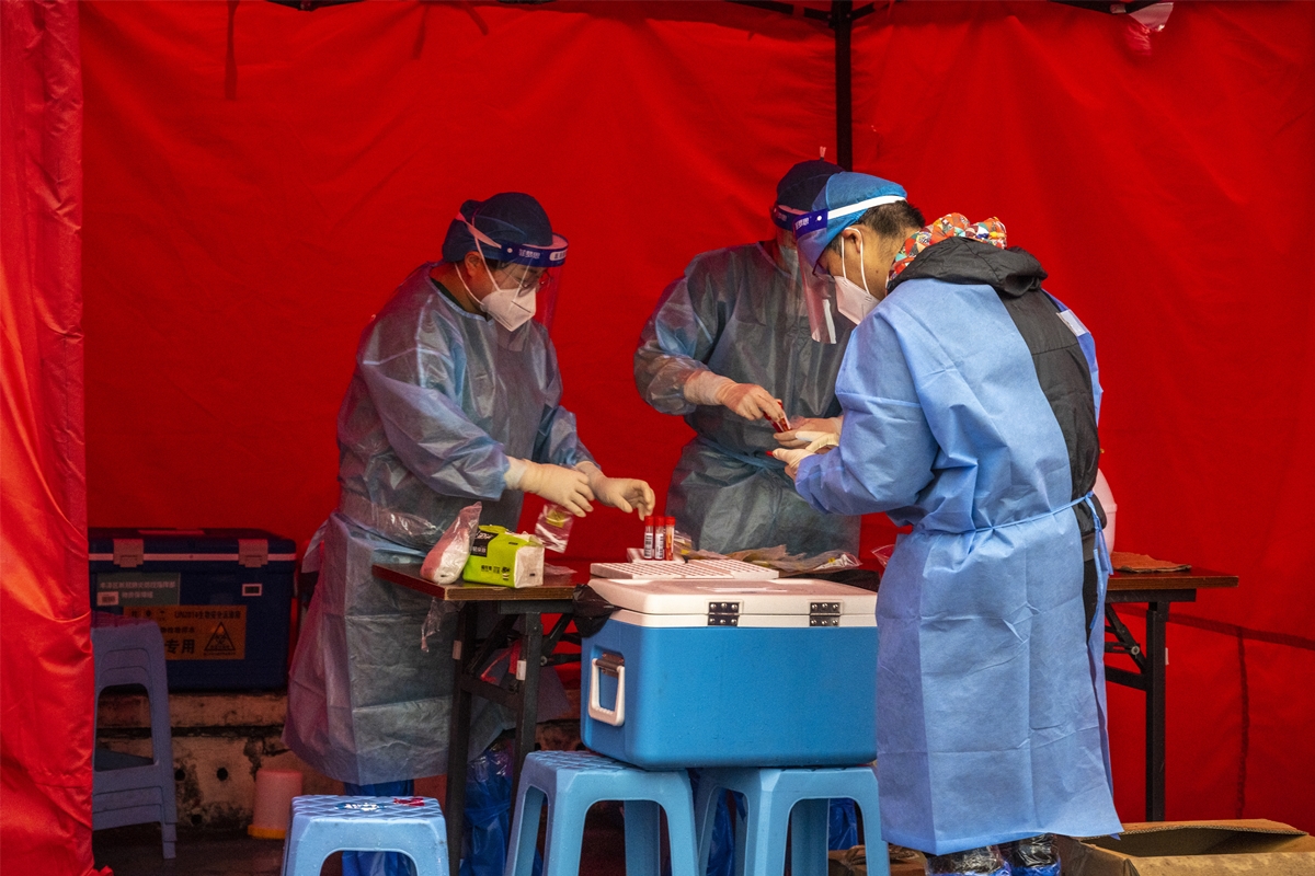 凌晨六点准时开始核酸检测,他们至少提前一小时到场布场:一个个试管贴标签,还不能贴歪,否则手机扫描不了识别不到;一道次一道次地分发信息采集用的手机,检测用的棉签、试管,以及消杀用的酒精、消毒液等……