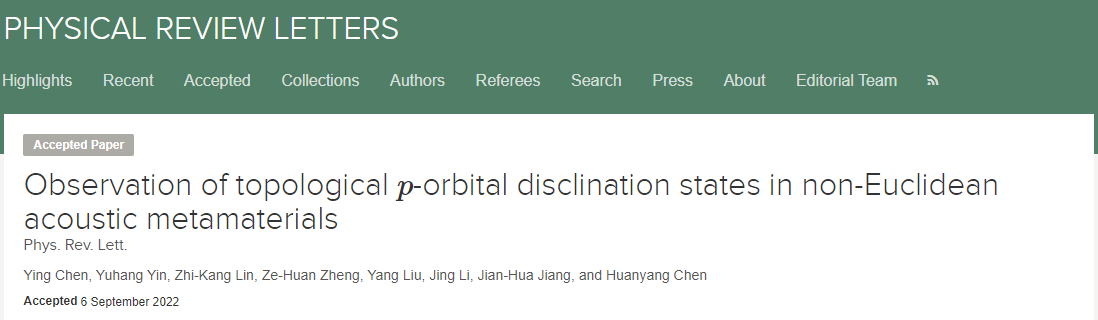 近日,sjb世俱杯信息学院物理系教师陈颖与厦门大学陈焕阳教授以及苏州大学蒋建华教授团队合作,在国际顶级物理期刊《Physical Review Letters》(中科院一区, IF:9.161)上发表了题为《Observation of topological p-orbital disclination states in non-Euclidean acoustic metamaterials》的研究论文,首次在非欧声学超材料结构中观察到了p轨道拓扑旋错态,为将来在弯曲表面探索更多纳米材料的拓扑特性激发新的思路。