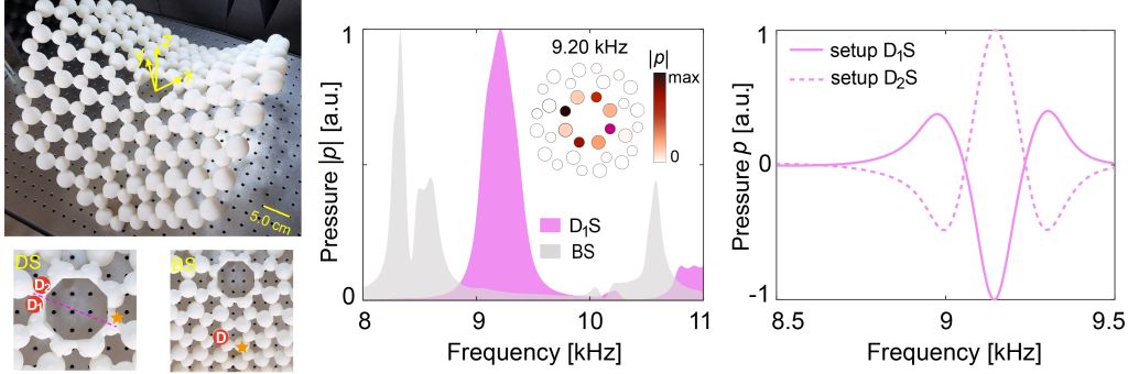 该论文主要研究了声学石墨烯晶格中旋错缺陷引起的拓扑局域态,不同于以往实验工作研究平面(欧式)几何内的旋错,本工作通过Kamada-Kawai算法分别得到了切除或增加2π/3完美晶体的扇区后所对应的锥形或双曲形的曲面旋错结构,考虑了缺陷处局部曲率对旋错态的影响,并利用三维打印技术构建了该非欧几何形状的声学拓扑晶体。通过理论计算、数值模拟和实验表征结合的方式,在拓扑带隙中观察到了旋错缺陷处具有p轨道分布的局域态,并且这些态会呈现出奇对称和偶对称的分布特征。