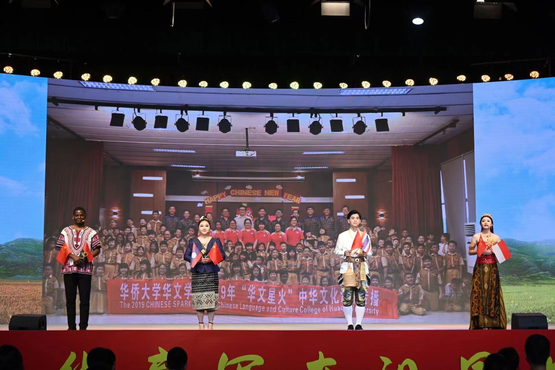 节目最后,华文学院来自泰国、印尼、缅甸、老挝、安哥拉、菲律宾、爱尔兰、南非、赞比亚、孟加拉等10个国家的18位留学生代表齐唱原创歌曲《世界一家》,点燃现场气氛。