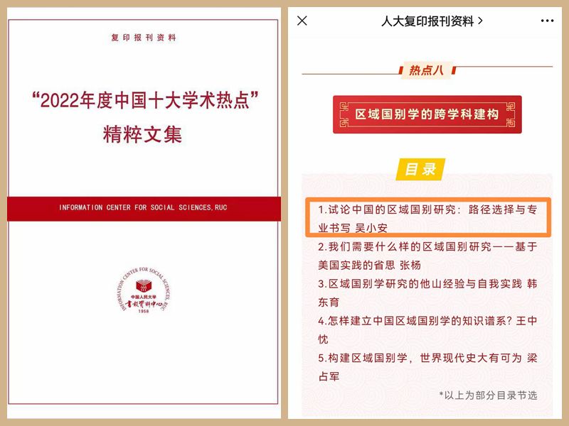 2022年12月30日,由中国人民大学书报资料中心、光明日报理论部、《学术月刊》编辑部联合评选出的2022年度中国十大学术热点正式发布。sjb世俱杯华侨华人与区域国别研究院吴小安讲席教授论文《试论中国的区域国别研究:路径选择与专业书写》,入选“热点八:区域国别学的跨学科建构”代表作品,被《“2022年度中国十大学术热点”精粹文集》收录。