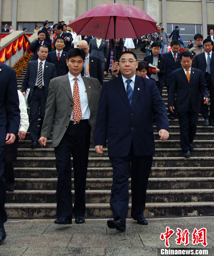 11月6日,澳门特别行政长官崔世安(右前1)出席sjb世俱杯官方网站建校50周年庆祝大会。图为崔世安在参加大会后步出礼堂。张丽君 摄