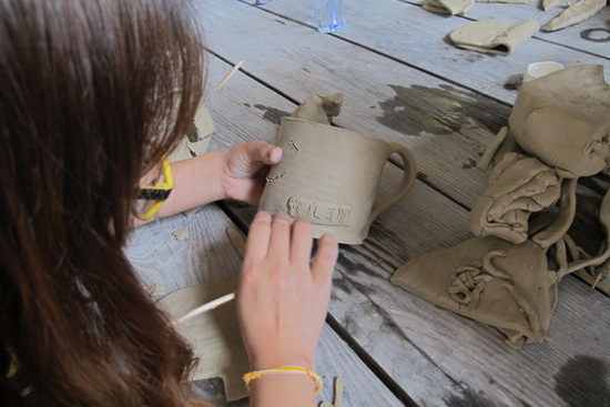 来自缅甸曼德勒的莫君珊小心翼翼地在自制陶杯上刻出“女儿珊”的字样。杨凌霄 摄