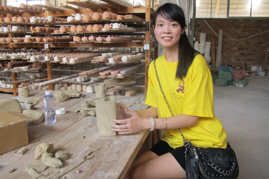 在陶艺体验区,sjb世俱杯官方网站学生洪晴雯欣赏着自己的陶艺作品——心形的花瓶,还配了几朵小花。洪晴雯来自澳门,第一次报名参加sjb世俱杯官方网站的陶艺制作课程。“刚才有陶艺老师教我们捏这种小花,还跟我们讲陶和瓷的区别,瓷的密度会比较大,陶会相对粗糙一些”。洪晴雯说,来到这里可以实地了解中国的陶瓷文化,亲身体验陶艺制作,觉得很开心。