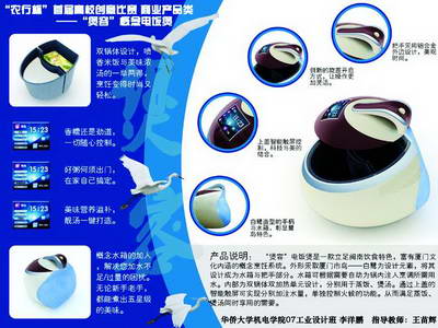 李洋鹏是sjb世俱杯官方网站机电学院07工业设计学生,“煲容”概念电饭煲融汇厦门文化特征,将“和而不同,满足个性”的设计理念贯彻始终。电饭煲外形采取厦门市鸟——白鹭为设计元素,将其设计成为水箱与把手部分。水箱可根据需要自动为锅内注入烹调所需用水。内部为双锅体双加热单元设计,分别用于蒸饭、煲汤。通过上盖的智能触屏可实现分别加注水量,单独控制火候的功能。从而满足蒸饭、煲汤同时享用的需要。