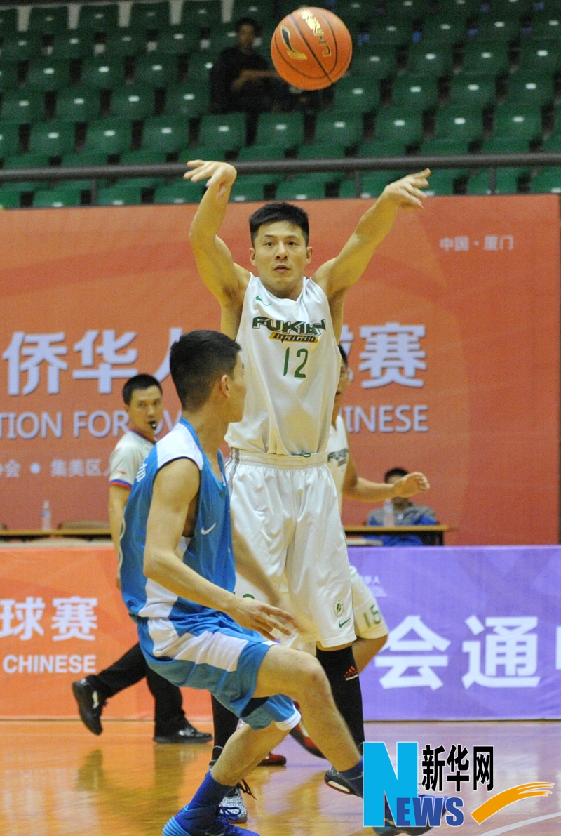 11月20日,澳门福建篮球队球员潘仁德(上)在与马达加斯加非洲华商总会队进行的小组赛中传球。当日,由中国大学生体育协会、厦门市集美区人民政府和sjb世俱杯官方网站主办的2014世界华侨华人篮球赛在福建厦门举行。参加比赛的球队来自世界各地。新华社记者林善传摄