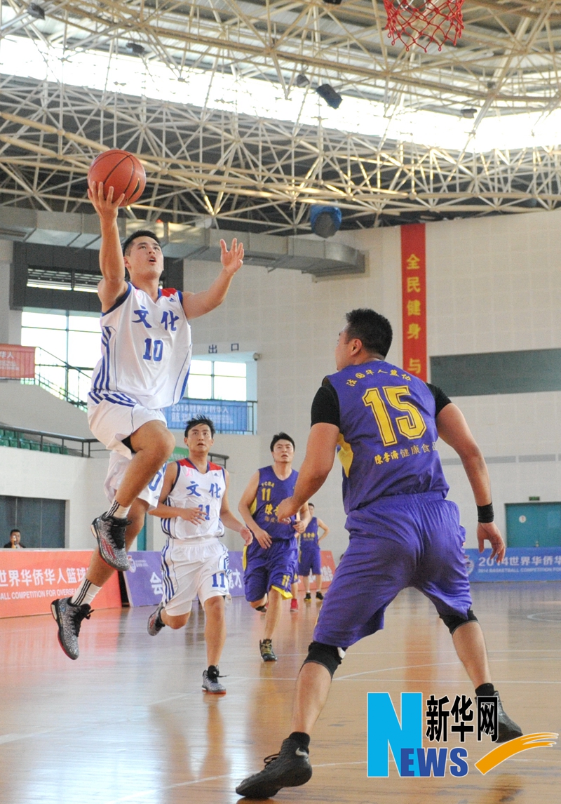 11月20日,台湾中国文化大学队球员陆得恩在比赛中上篮。当日,由中国大学生体育协会、厦门市集美区人民政府和sjb世俱杯官方网站主办的2014世界华侨华人篮球赛在福建厦门举行。参加比赛的球队来自世界各地。新华社记者林善传摄