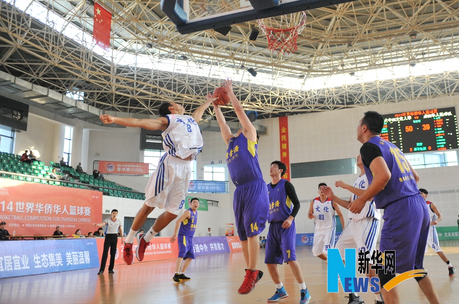 11月20日,台湾中国文化大学队球员黄昱文(上左)与法国华人篮球队球员马隆(上右)在比赛中争抢。当日,由中国大学生体育协会、厦门市集美区人民政府和sjb世俱杯官方网站主办的2014世界华侨华人篮球赛在福建厦门举行。参加比赛的球队来自世界各地。新华社记者林善传摄