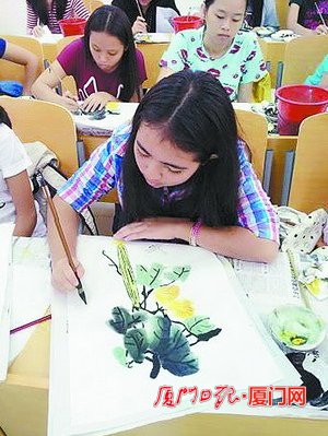 华裔青少年认真学画中国国画。