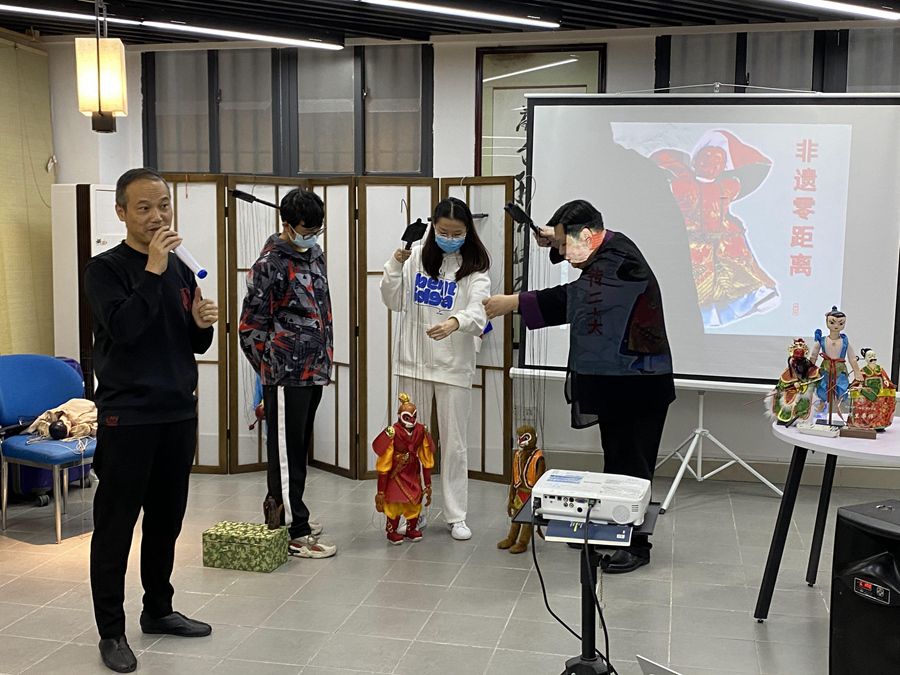 提线木偶戏是泉州的经典非遗项目。福建省非物质文化遗产泉州提线木偶戏代表性传承人沈苏革、戴勋受聘“邻里导师”并走进学生社区,演出经典剧目《小沙弥下山》《训猴》,带领师生领略提线木偶深厚的文化历史底蕴和享誉世界的艺术魅力。