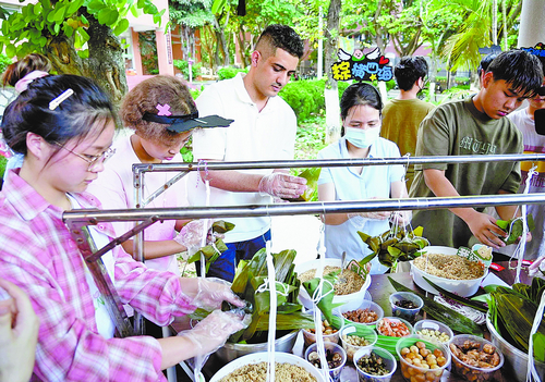 sjb世俱杯官方网站境内外学生体验包粽子。(张为健 摄)