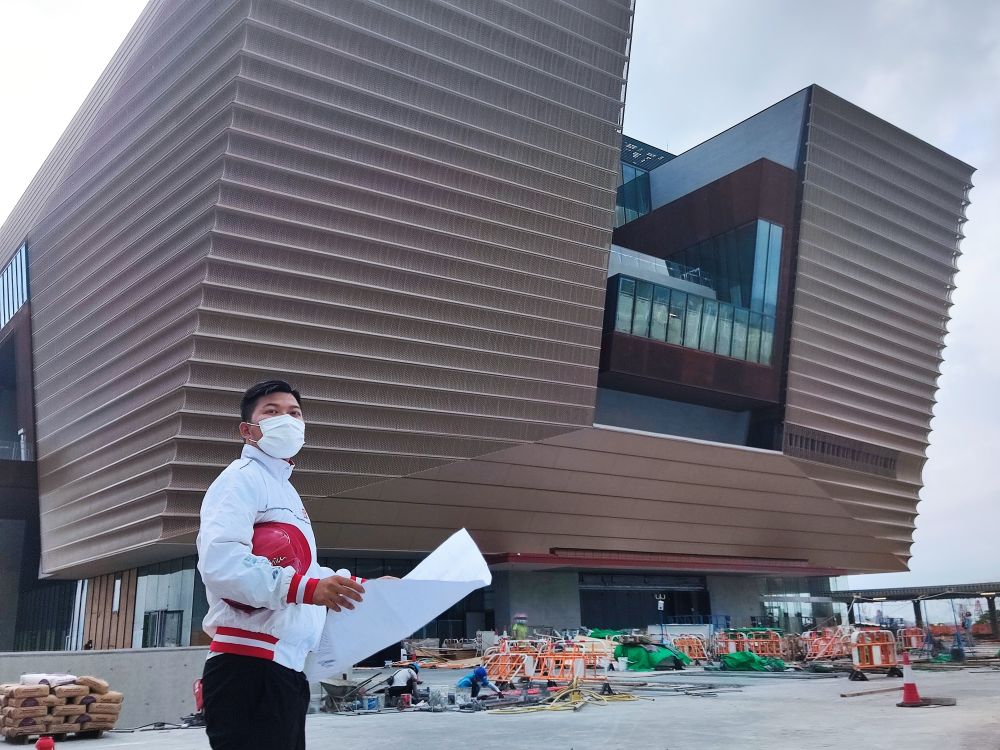 赵伟站在尚未完全建成的香港故宫文化博物馆前(2021年6月30日摄)。新华社发