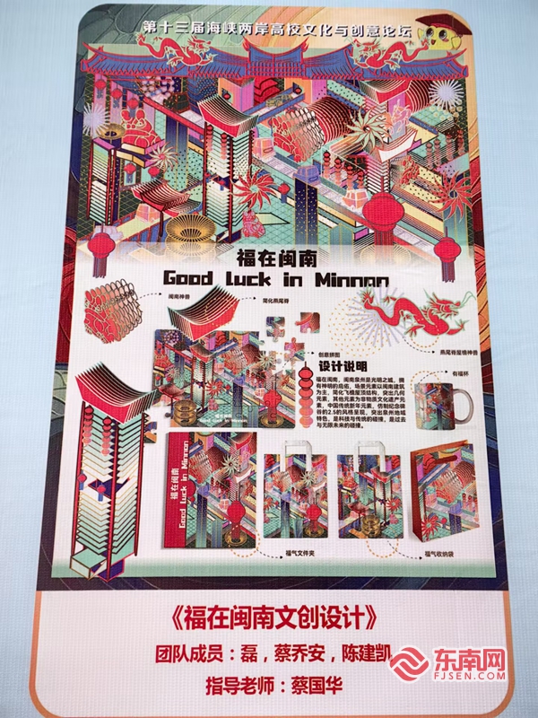 其中,论坛中的“福”文创产品设计大赛自十月份启动以来,受到两岸青年的广泛关注,共评出特等奖1项,一等奖3项,二等奖5项,三等奖8项,优秀奖13项,优秀指导老师5人,优秀个人8人,并在闭幕式上进行颁奖。