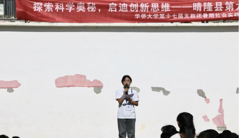 活动伊始,晴隆县第六小学陈英英校长鼓励在场的每一位学生踊跃参与科技文化节各项活动,深切体验科学的独特魅力。紧接着,支教团团长曾子洋进行发言,她希望通过此次科技文化节,能够引领学生们踏上一场探索科学奥秘的奇妙旅程,在心灵深处播下创新的种子,让每一位孩子都能在未来的道路上,以科学的眼光观察世界,以创新的思维引领未来。