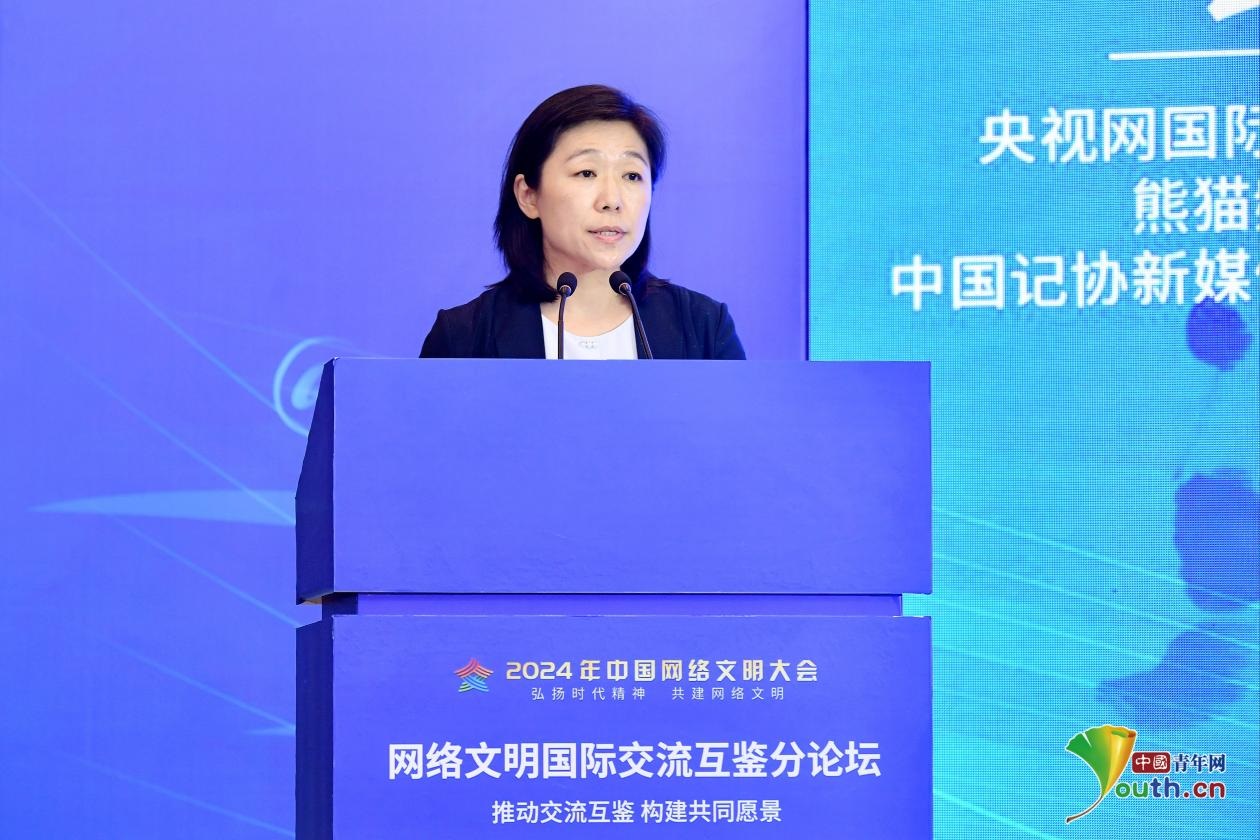 8月29日上午,2024年中国网络文明大会网络文明国际交流互鉴论坛在成都举办。图为央视网国际传播事业群总经理、熊猫频道中心总监,中国记协新媒体专业委员会副秘书长衣炜作主题演讲。宋继祥 摄