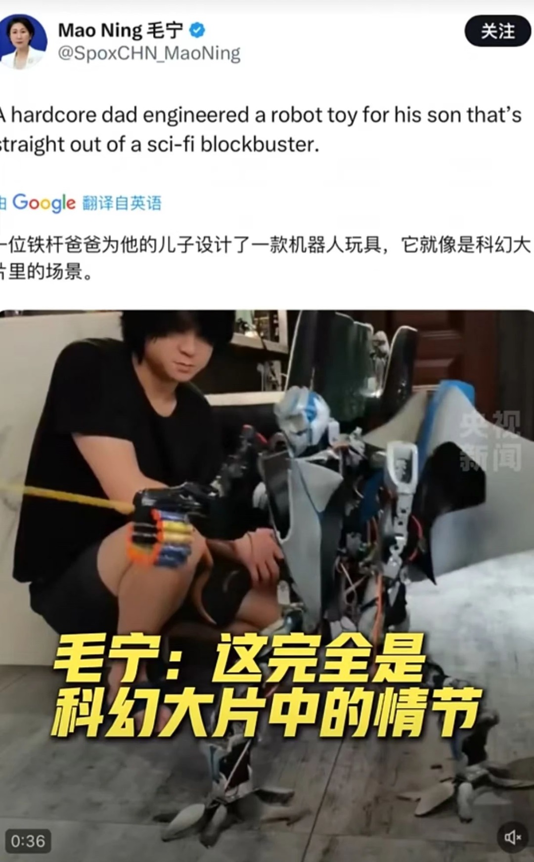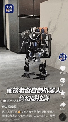 外交部发言人毛宁在社交平台转发该视频并配文称赞,“一位硬核老爸为自己儿子制造的机器人,它们就像直接从科幻大片中走出来的那样!”