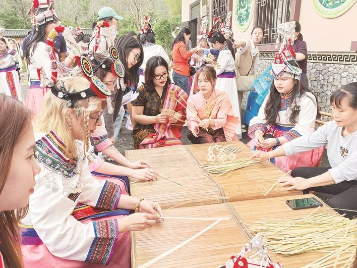 ▲中外女性代表体验非遗竹编制作