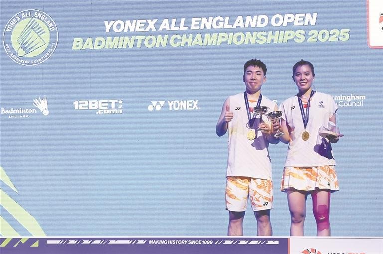 本报讯 (融媒体记者吴聪伟)北京时间3月17日凌晨,2025年全英羽毛球公开赛落幕,中国选手获得两冠两亚,其中华大学子郭新娃与搭档陈芳卉夺得混双金牌。