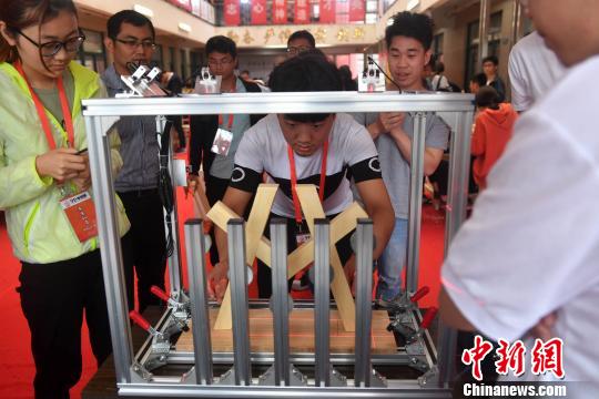 图为参赛的同学正在测试模型的承受力。 吕明 摄