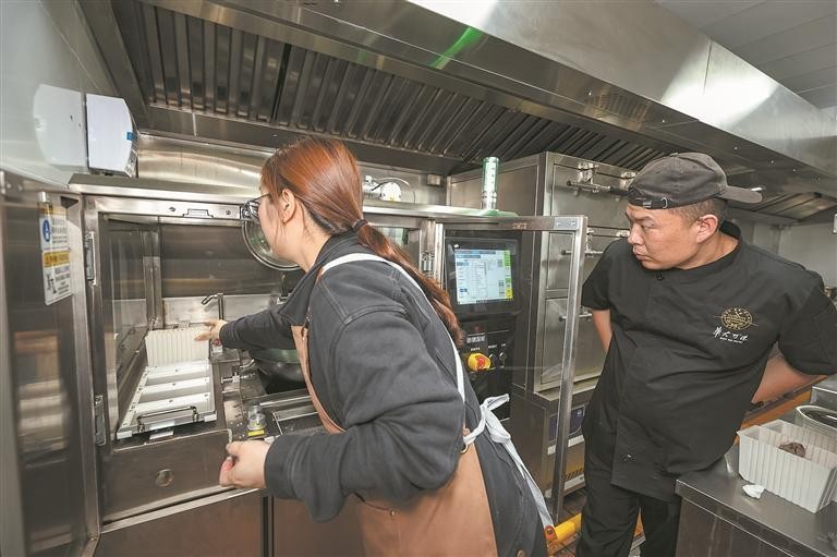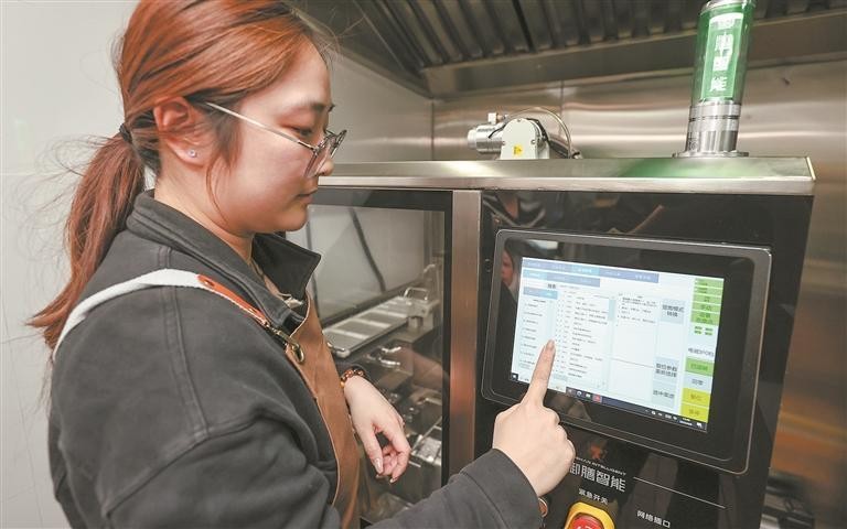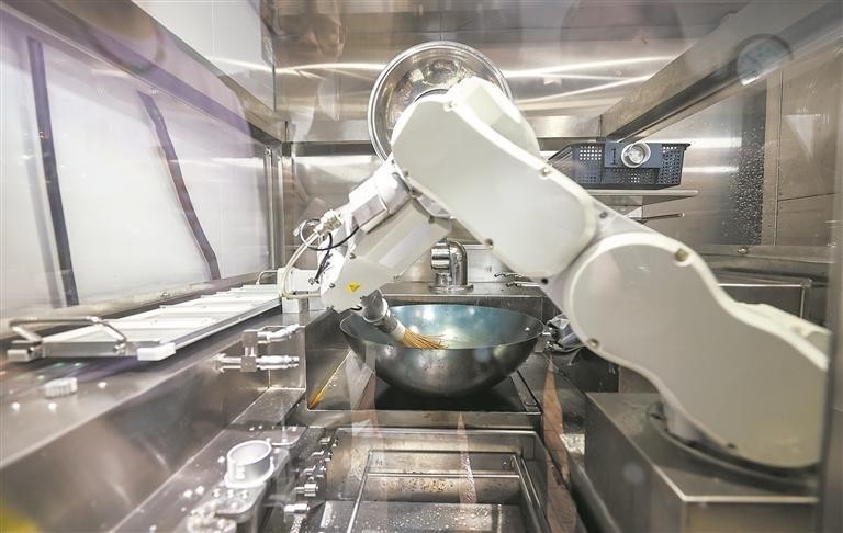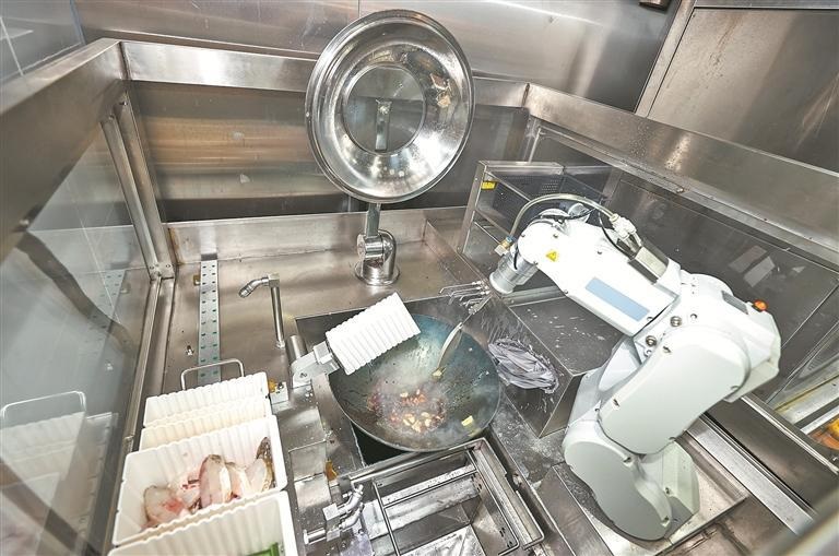 在可浓餐厅后厨,高约1.6米的“数字厨师”外形如同一个四方形带门灶台。打开玻璃门,中央铁锅上方有一个透明锅盖,下方是电磁炉,右侧是机械臂,铁锅四周环绕着调料盒、食材篮和厨具架,出油口、清洗口和下水口一应俱全。这是全球第一台使用机械臂实现多种烹饪技法的炒菜机器人。通过“数字厨师”门板上的显示屏,选择“炣杂鱼”菜单后,“数字厨师”开始运行:热锅、倒油、倒入姜蒜爆香、灌入酱油水煮沸、加入处理好的杂鱼、盖锅焖煮……一整套动作行云流水,分毫不差。