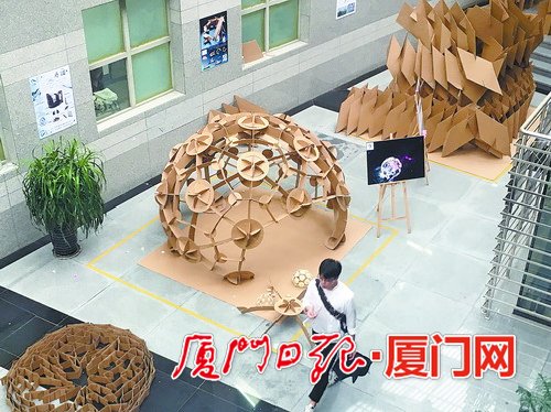 大学生用瓦楞纸搭盖的建筑。(本报记者 应洁 摄)